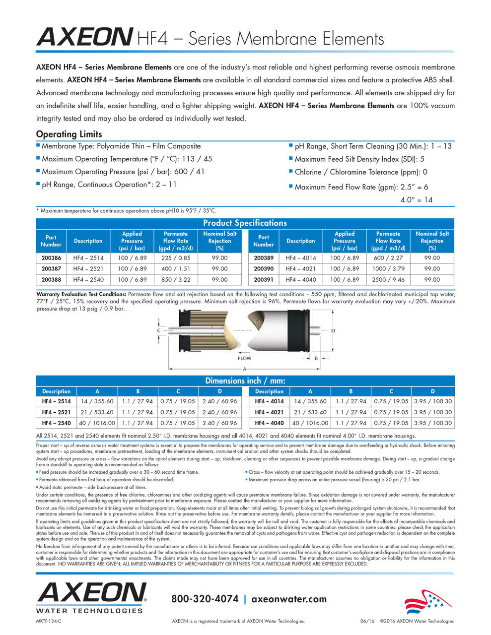 Genuine Axeon HF4-2514 RO membrane offers reliability, high performance, and consistent results for commercial applications. The 2.5 x 14-inch HF4 membrane offers extra low energy consumption with high flow capacities at low applied pressures. All membranes are shipped dry for indefinite shelf life, are 100% vacuum integrity tested and can also be ordered as individually wet tested.