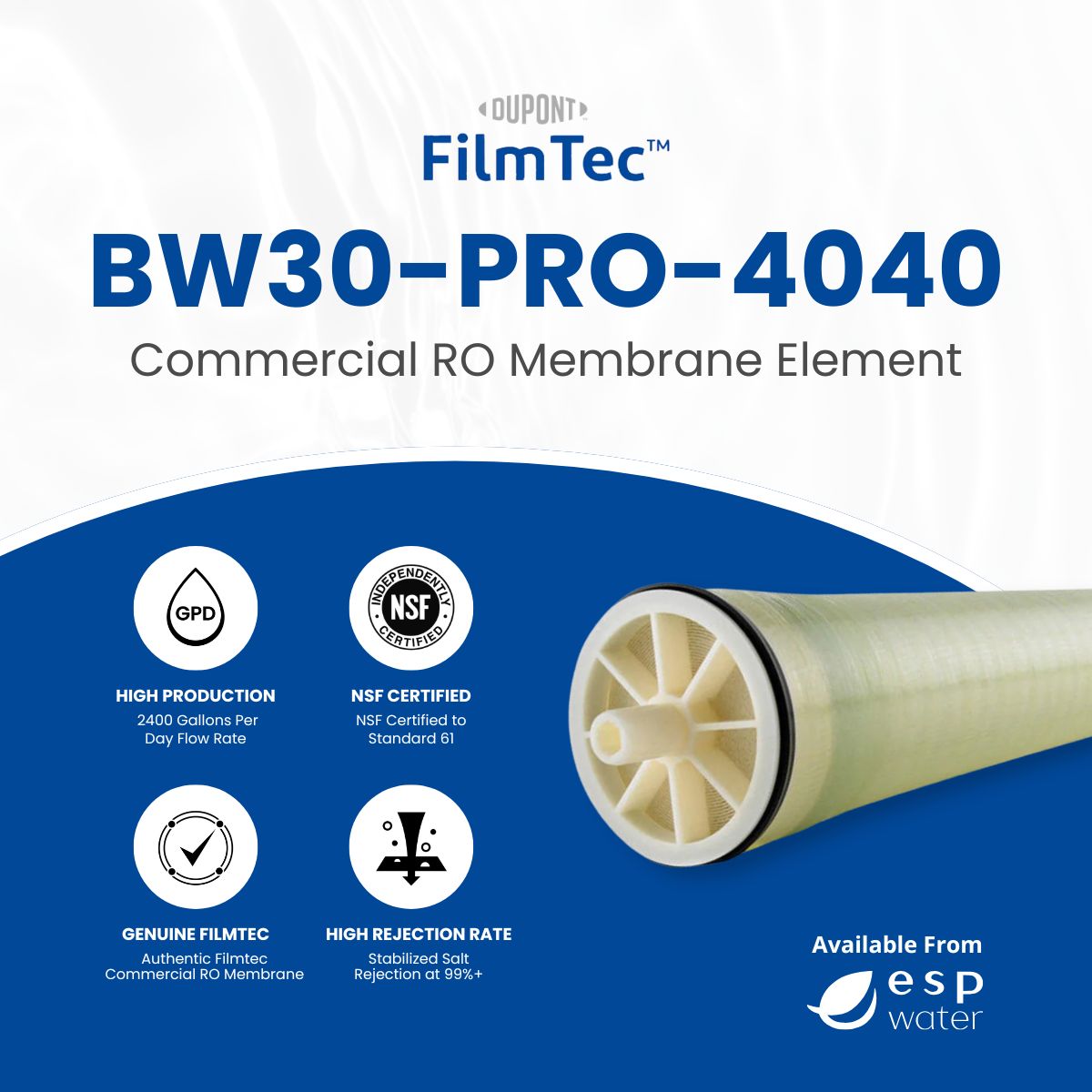 La membrana FilmTec BW30 PRO-4040 RO es ideal para operar en diversas situaciones, incluidas aquellas que requieren un alto rechazo de NaCl. Para prolongar la vida útil, esta membrana emplea filtración de flujo cruzado. A medida que se acumula materia en la superficie de la membrana, el agua entrante la barrerá y la sacará a través de la corriente de rechazo y el agua purificada fluirá por una corriente separada.