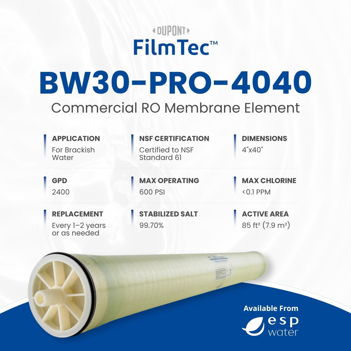 Brackish water RO membrane produces up to 2400 GPD with high salt rejection at 600 PSI.