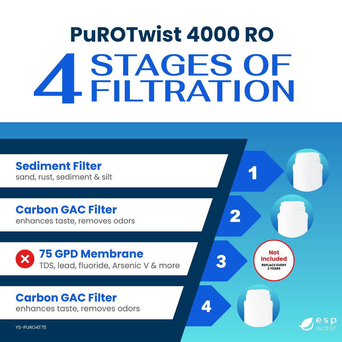 - STAGE 3 - 0x (RO Membrane TQ56-75-XHR-FC200 Sold Separately or with Replacement Kits YSM-PURO4T75) - Replace every 24 months