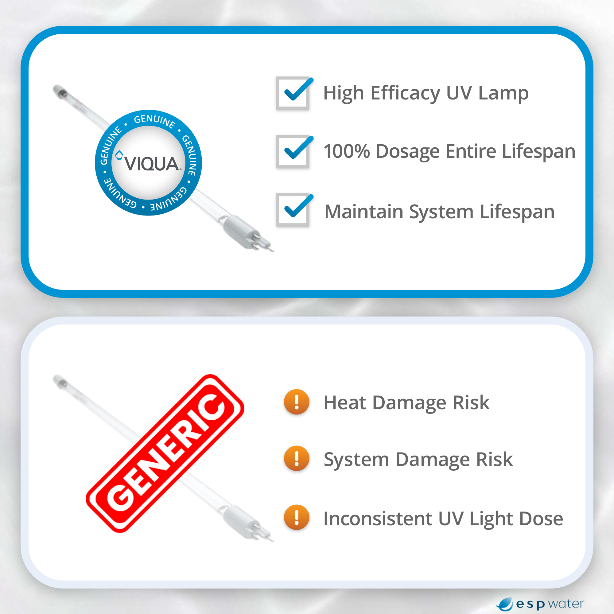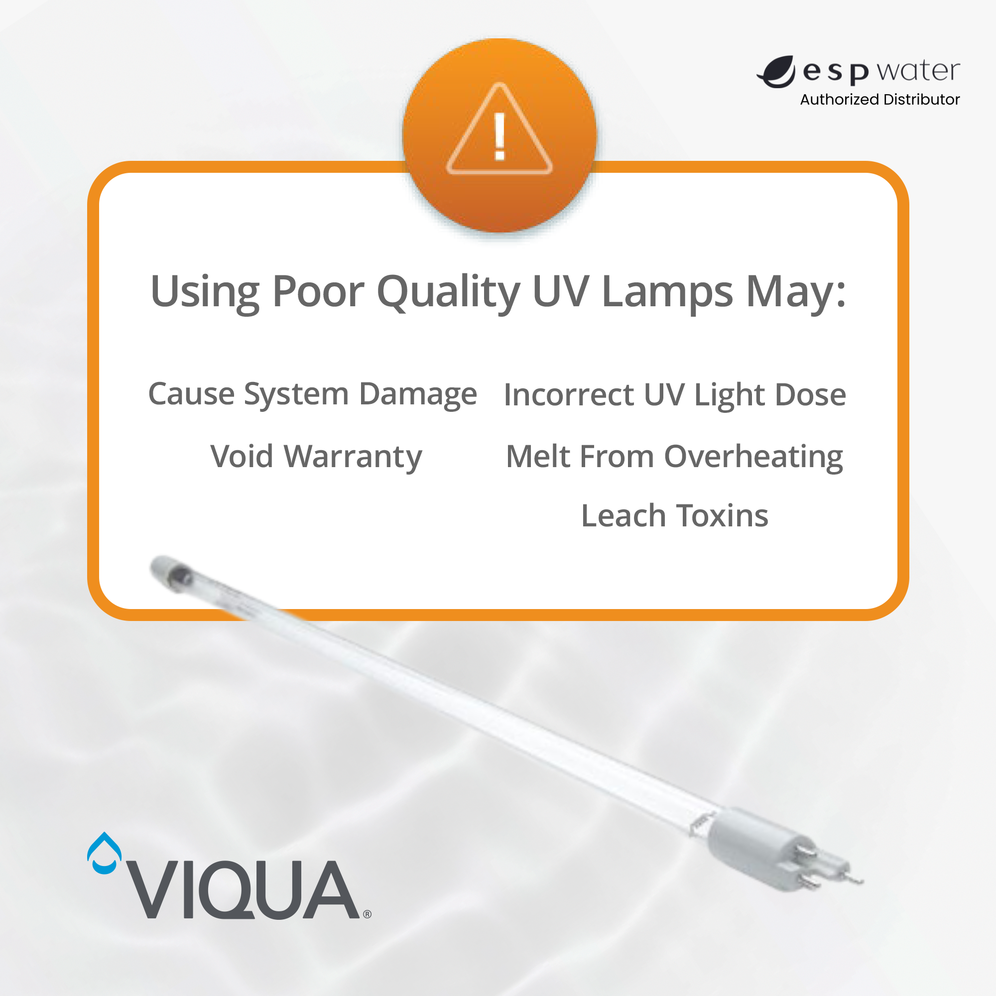 Why using a genuine VIQUA lamp is important: VIQUA UV systems and lamps are tested and certified as a complete unit. Using an authentic VIQUA lamp ensures proper system performance and water treatment. This video explains the 5 risks of non-VIQUA aftermarket lamps and how to identify authentic VIQUA lamps.
