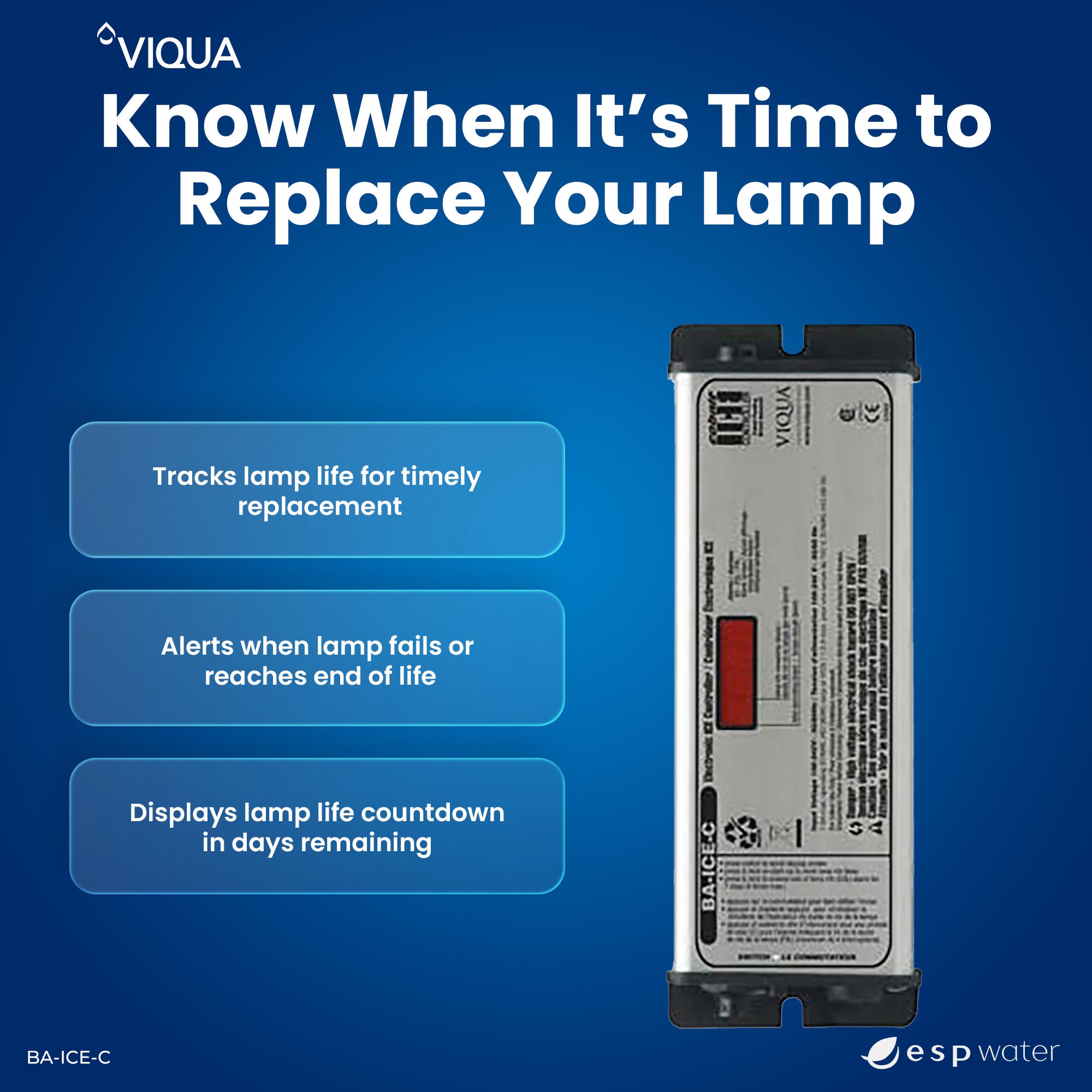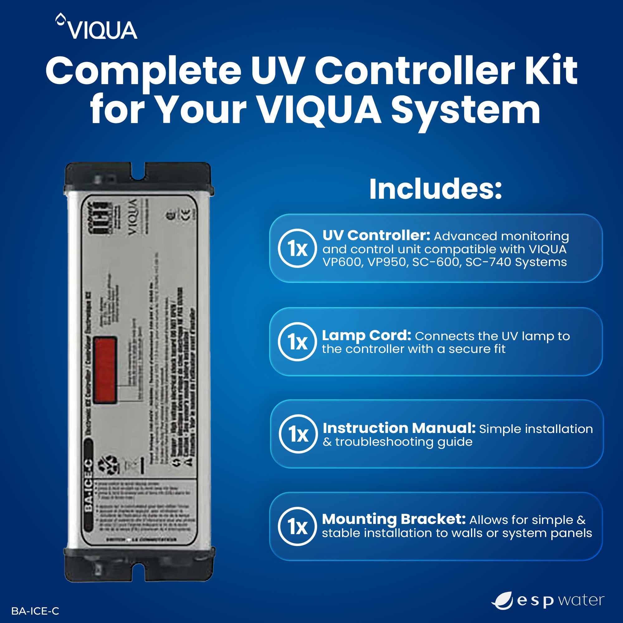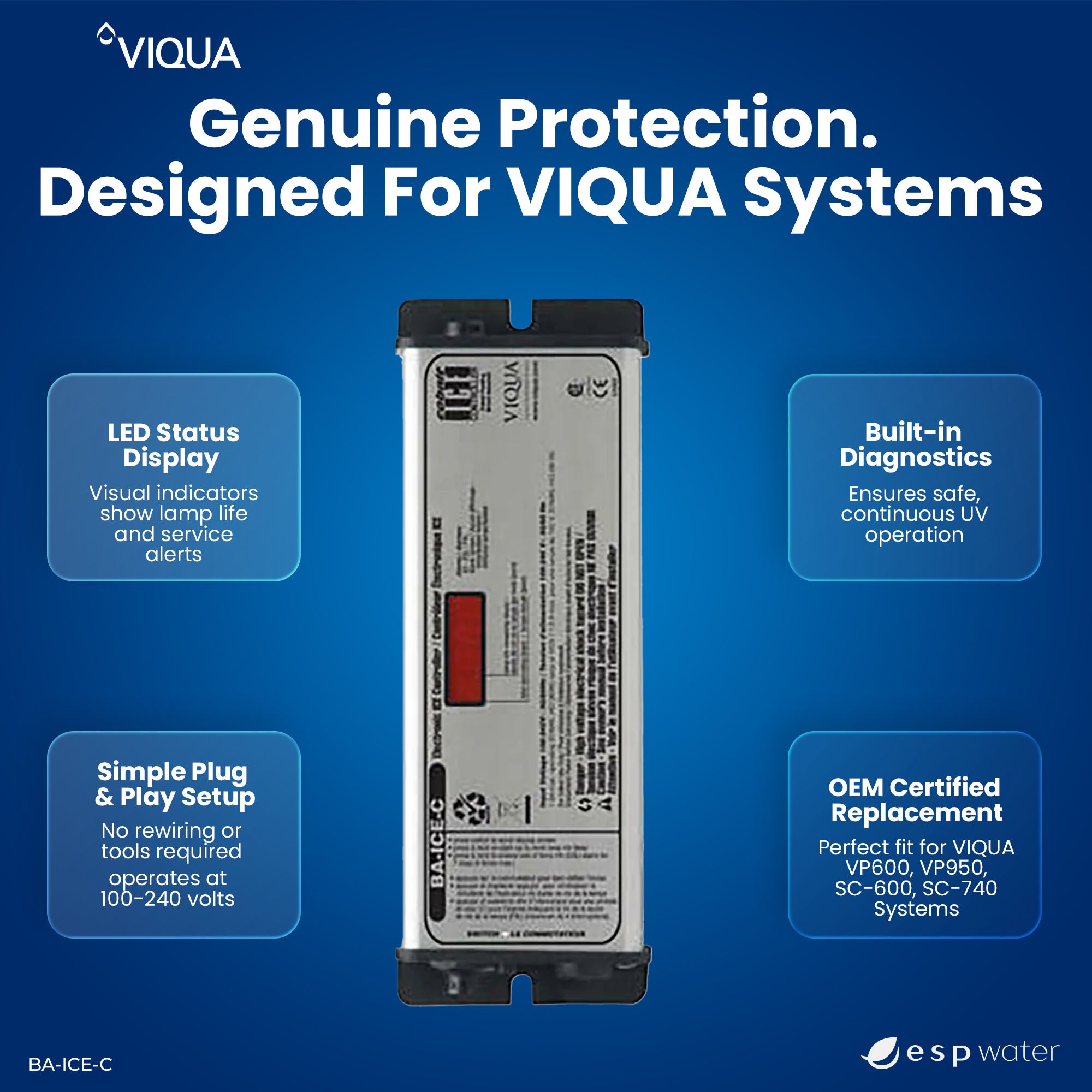 El controlador de reemplazo BA-ICE-C está diseñado para usarse con los sistemas de desinfección de agua VIQUA VP600 , VP950 y los sistemas UV modelo SC-600 y SC-740 descontinuados.