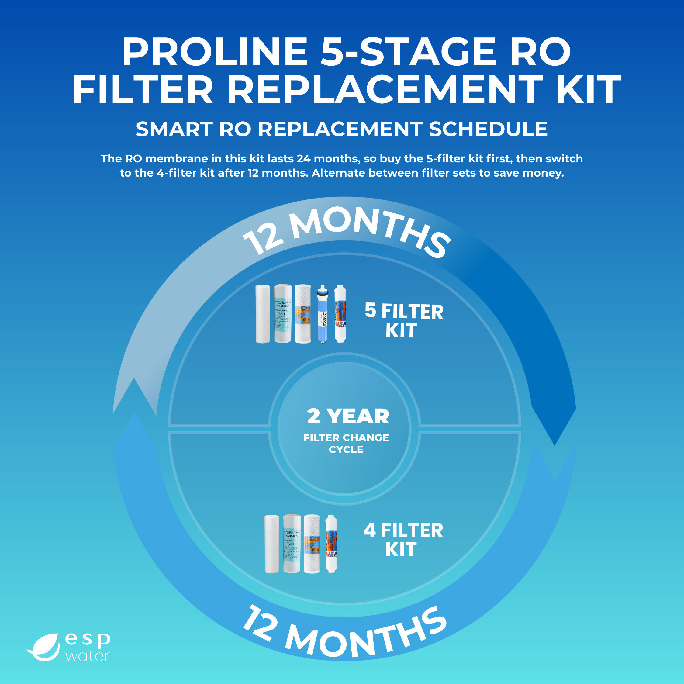 Ideal for your first full replacement, this kit includes all filters plus the RO membrane, which typically lasts up to 24 months. -
