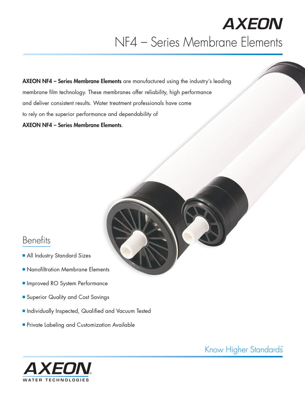 The AXEON NF4 series RO membranes offer reliability, high performance, and consistent results for commercial applications. The NF4 offer high flow performance that includes a 90% average ion rejection with an applied pressure of 70 psi. AXEON membranes are compliant with FDA standards, suitable for industrial and sanitary applications. All membranes are shipped dry for indefinite shelf life, are 100% vacuum integrity tested, and can also be ordered as individually wet tested.