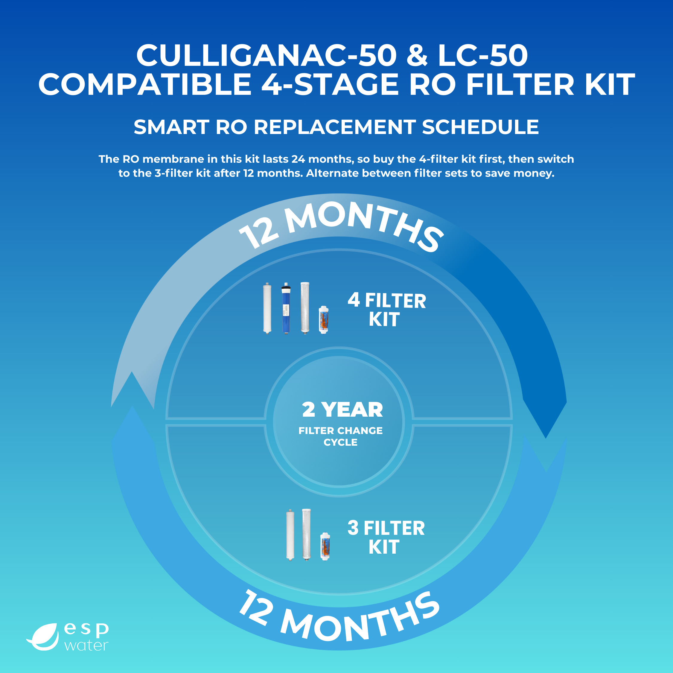 Ideal for your first full replacement, this kit includes all filters plus the RO membrane, which typically lasts up to 24 months. -