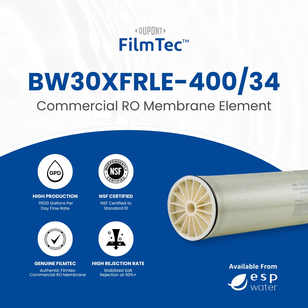 FilmTec BW30XFRLE-400/34 RO Membrane Low Energy Brackish 11500 GPD 8"x40"