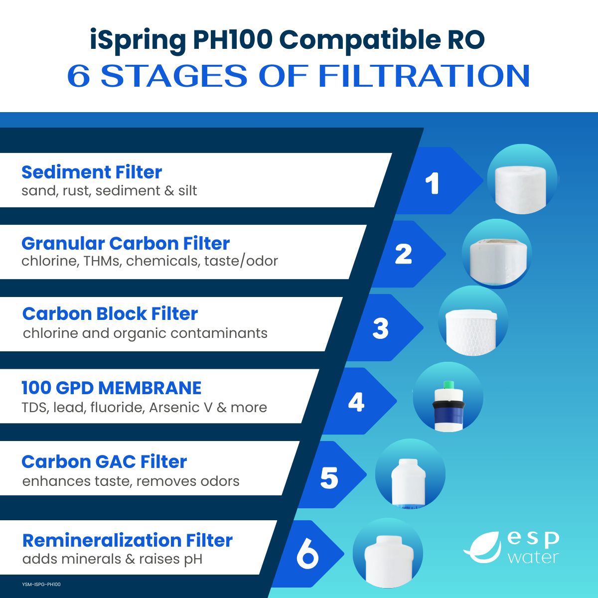 Each iSpring system has a specific filter set. For example, the PH100 6-Stage and RO100 5-Stage use different replacement cartridges than the PureDrop RTW5. Always match your model number when selecting from ESP Water’s iSpring model pages.