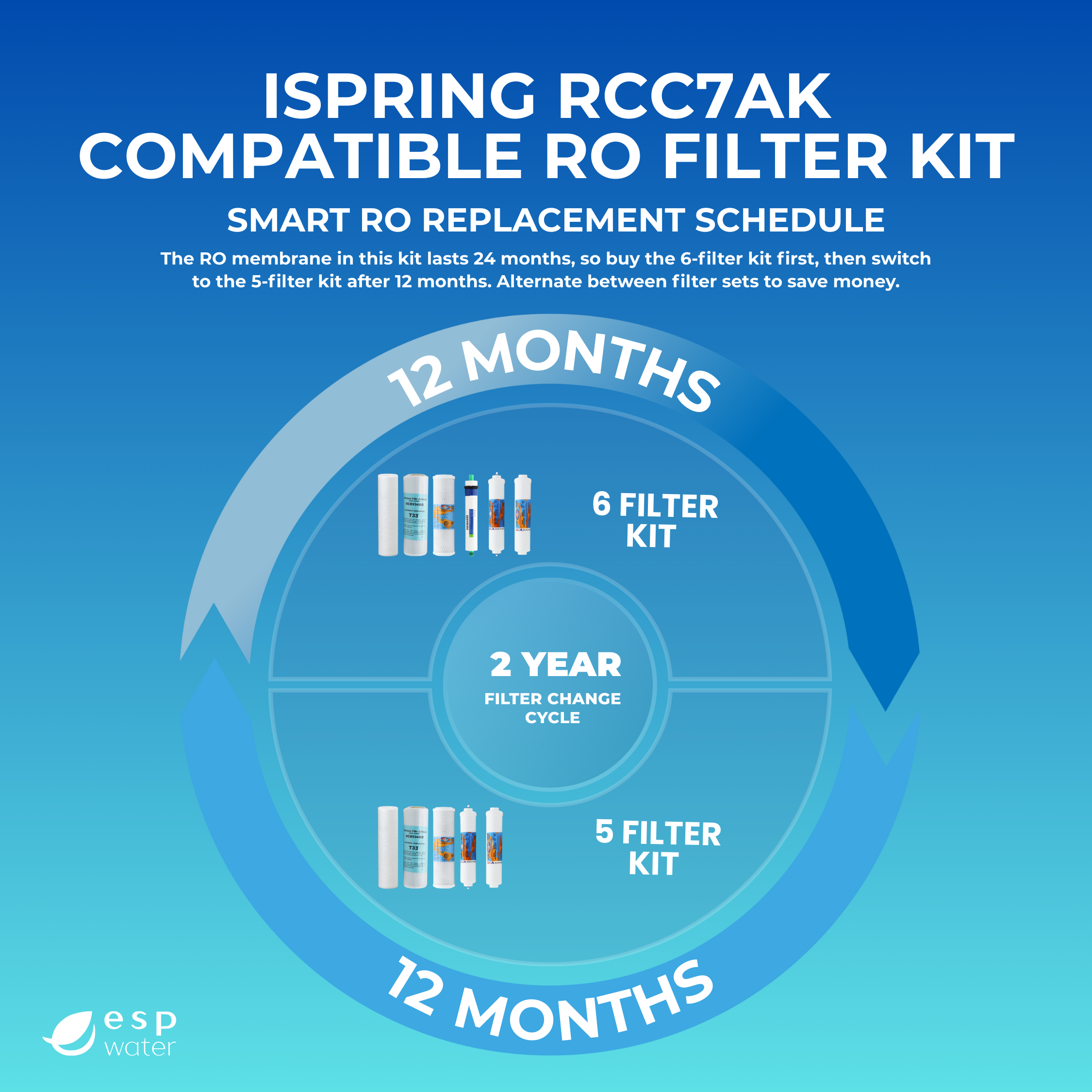 Most iSpring systems require sediment and carbon pre-filters every 6–12 months, a post-carbon filter annually, and the RO membrane every 2 years, depending on usage. Replacement schedules apply across popular models like the iSpring RCC7 and RCC7AK. For guidance, see ESP Water’s RO Filter Replacement Instructions.