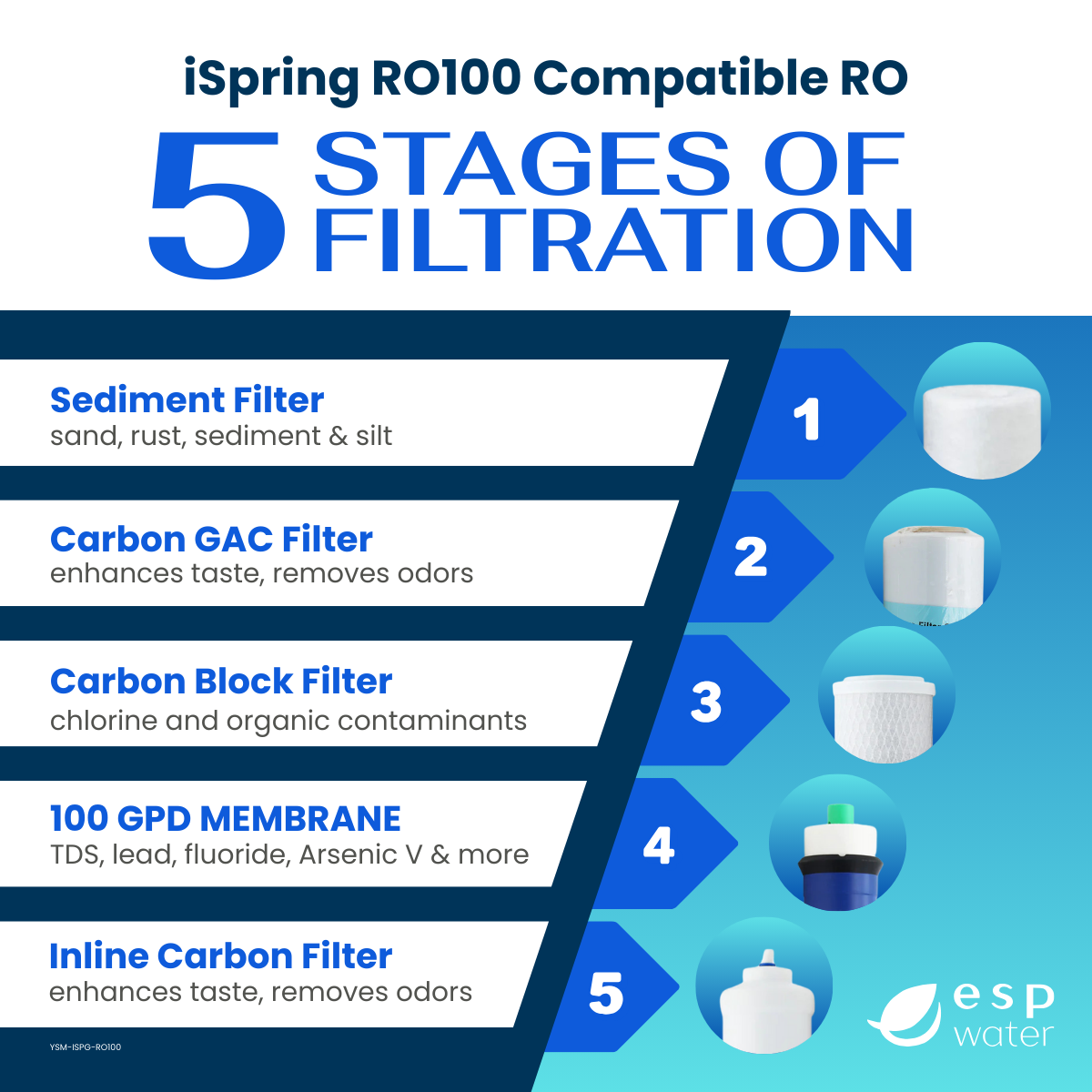 Each iSpring system has a specific filter set. For example, the PH100 6-Stage and RO100 5-Stage use different replacement cartridges than the PureDrop RTW5. Always match your model number when selecting from ESP Water’s iSpring model pages.