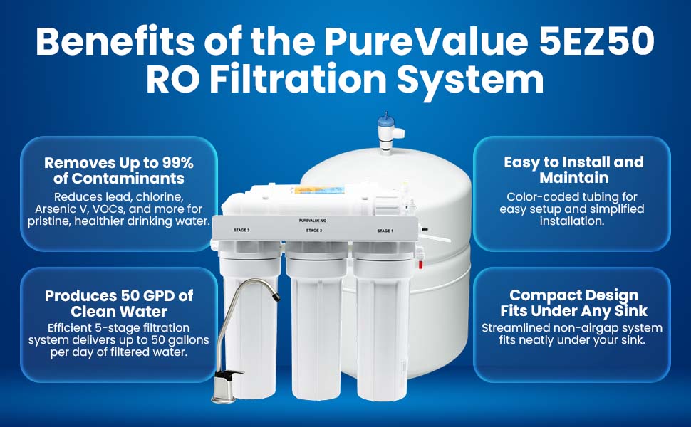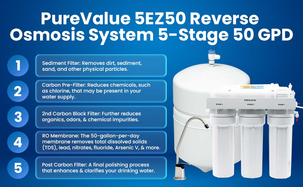 The PureValue 5EZ50 uses a 5-stage setup: sediment, two carbon block filters, a 50 GPD TFC RO membrane, and a post-carbon polishing filter. Replace the pre-filters every 6–12 months and the RO membrane every 2–3 years depending on water quality. View compatible replacements on the PureValue 5EZ50 Filter Replacement page.