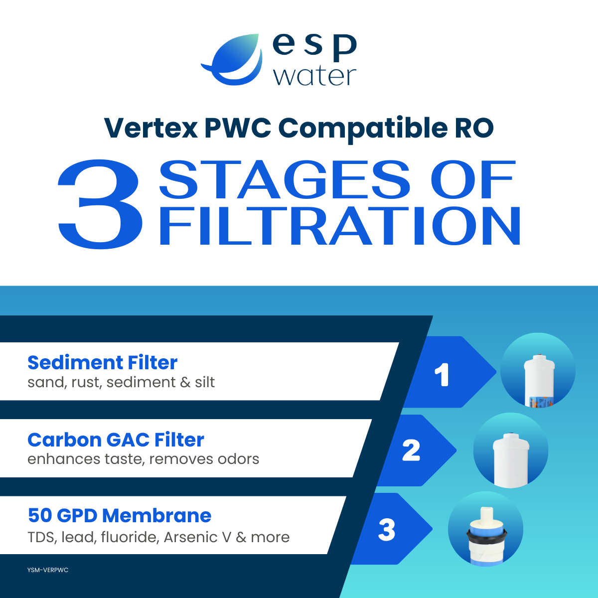 Check the label on your current membrane or your system manual for the GPD rating (such as 50 GPD or 75 GPD). ESP product pages, like those for the Vertex PWC-2000 and its filter kits, list the compatible membrane size so you can match the correct RO membrane for your Vertex system. See the model list on the Vertex RO replacement filters page.