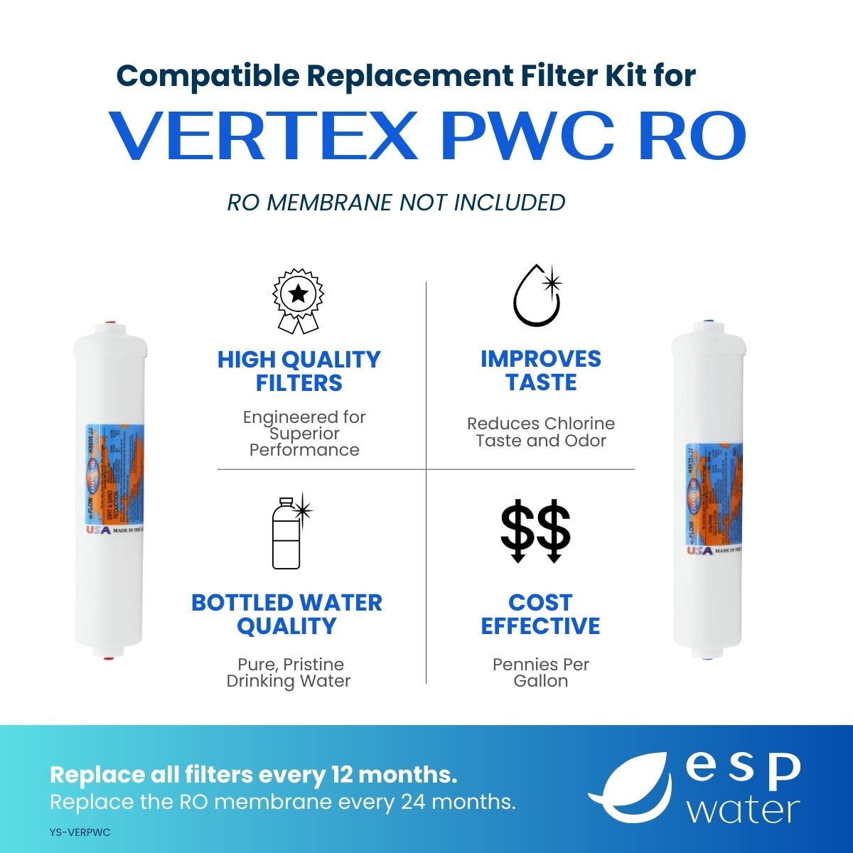 Filter Replacement Kit for Vertex PWC-400, PWC-500, PWC-600, PWC-1000, PWC-1010, PWC-1500, PWC-1800, and PWC-2000 Reverse Osmosis System (RO Membrane Sold Separately). Compatible with Vertex filter kit FK-104.