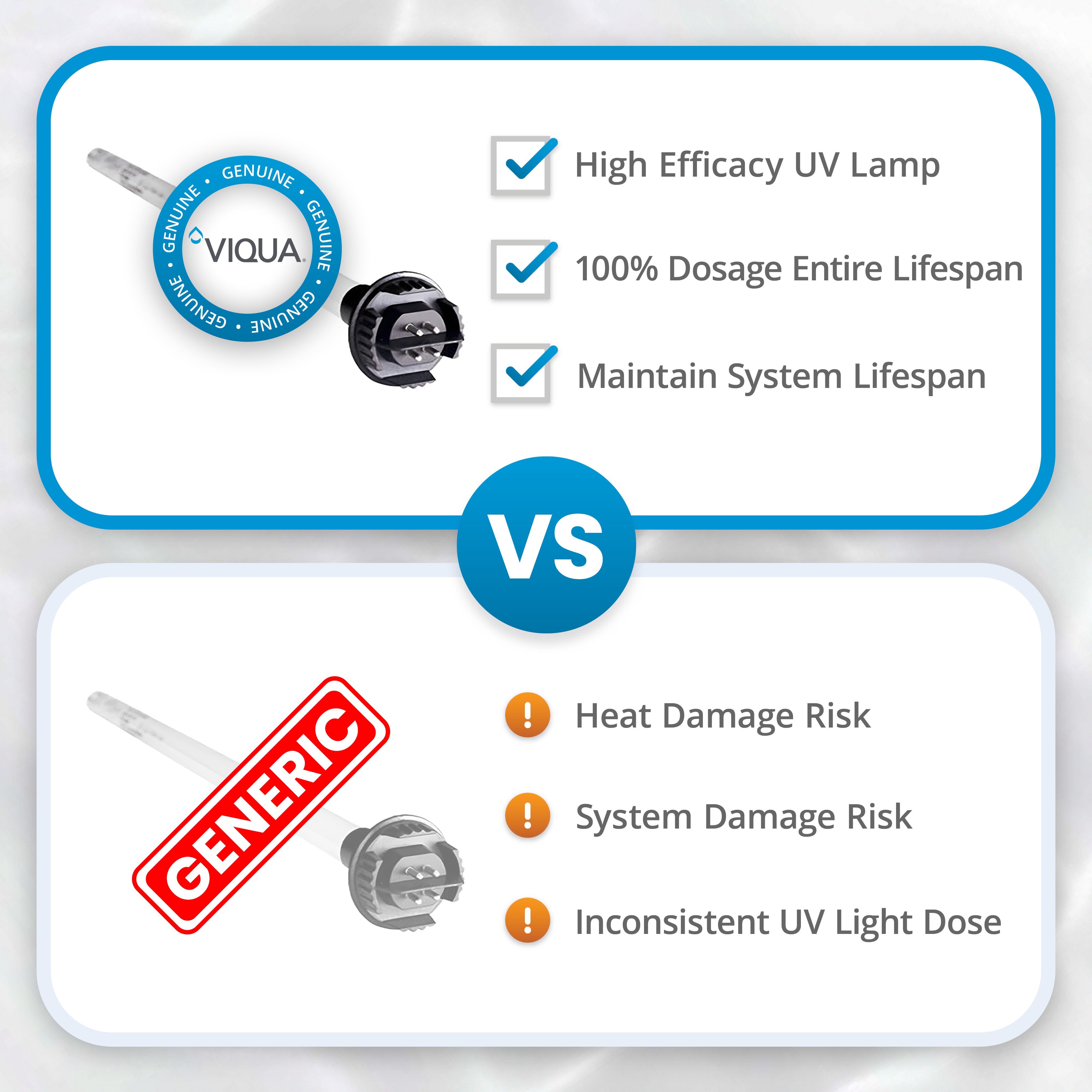 Why using a genuine VIQUA lamp is important: VIQUA UV systems and lamps are tested and certified as a complete unit. Using an authentic VIQUA lamp ensures proper system performance and water treatment. This video explains the 5 risks of non-VIQUA aftermarket lamps and how to identify authentic VIQUA lamps.
